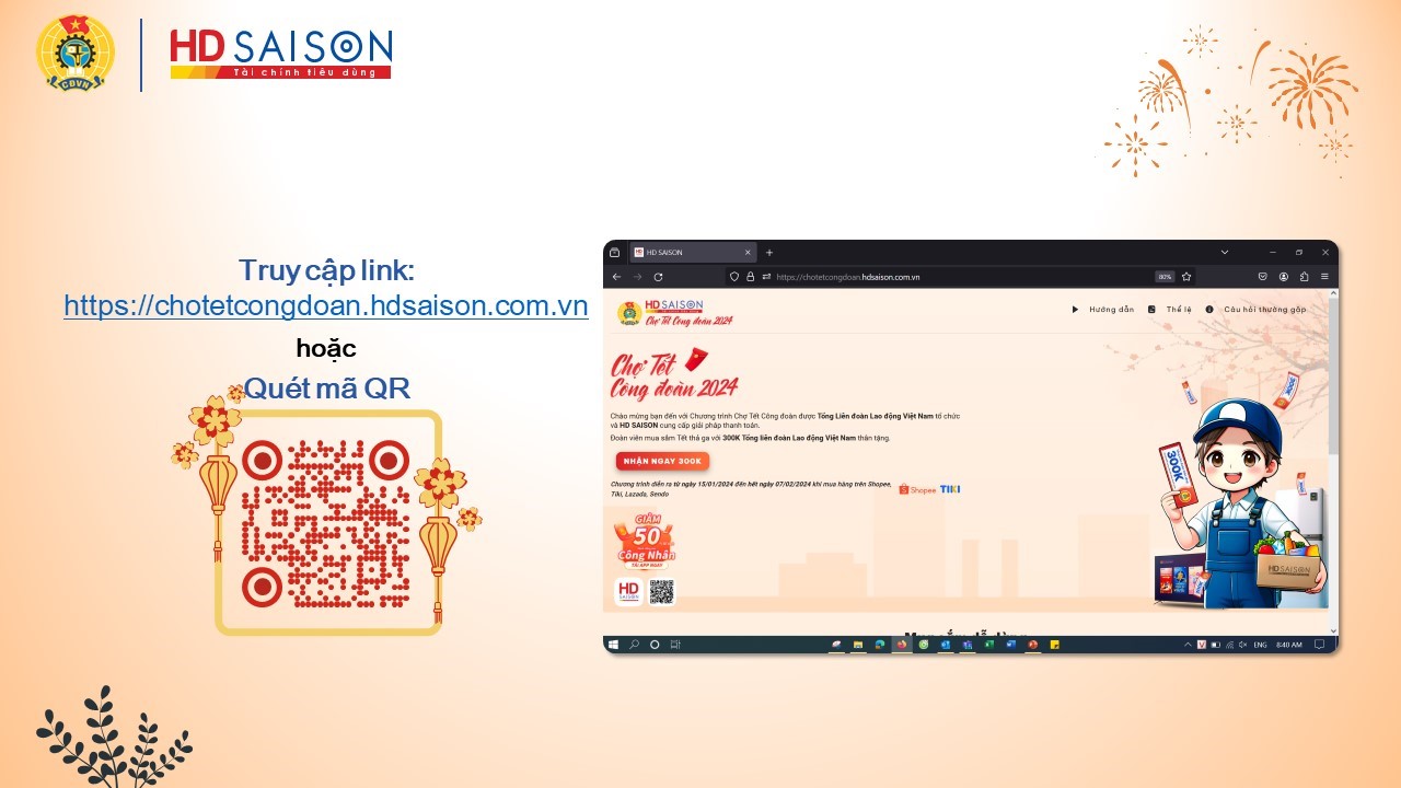 Một trong những hoạt động đổi mới trong chương trình “Tết Sum vầy” năm nay là Tổng Liên đoàn Lao động Việt Nam phối hợp với Công ty HD SAISON, sàn thương mại điện tử Shopee, Tiki tổ chức Chương trình “Chợ Tết Công đoàn năm 2024” qua sàn giao dịch thương mại điện tử.